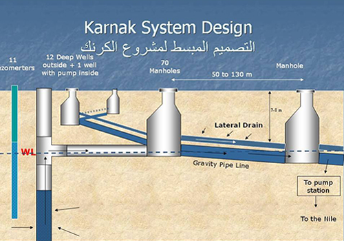 Monitored possible effects of groundwater lowering project in the Karnak Temple Complex. Designed, furnished and installed groundwater lowering system in front of Karnak Temple