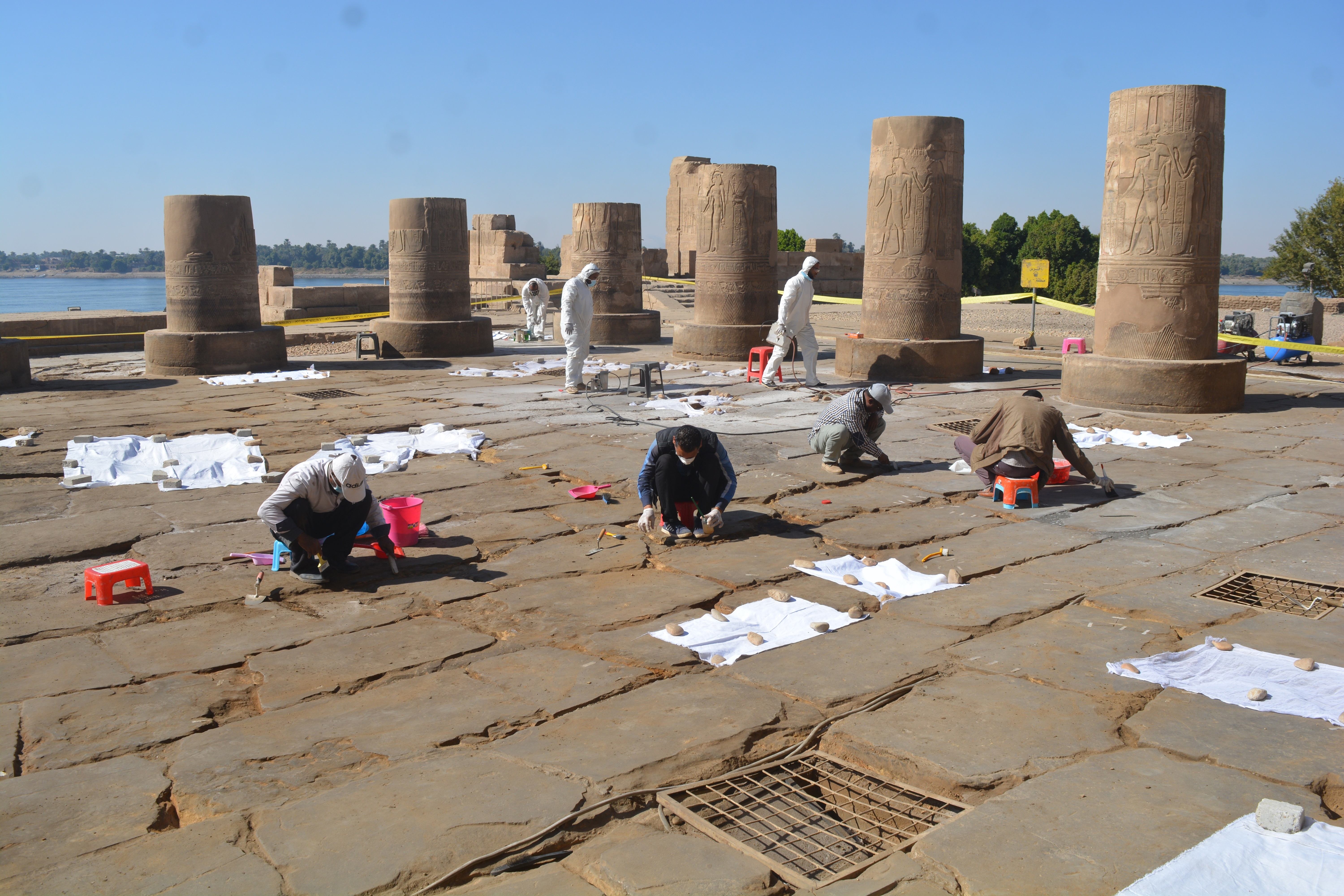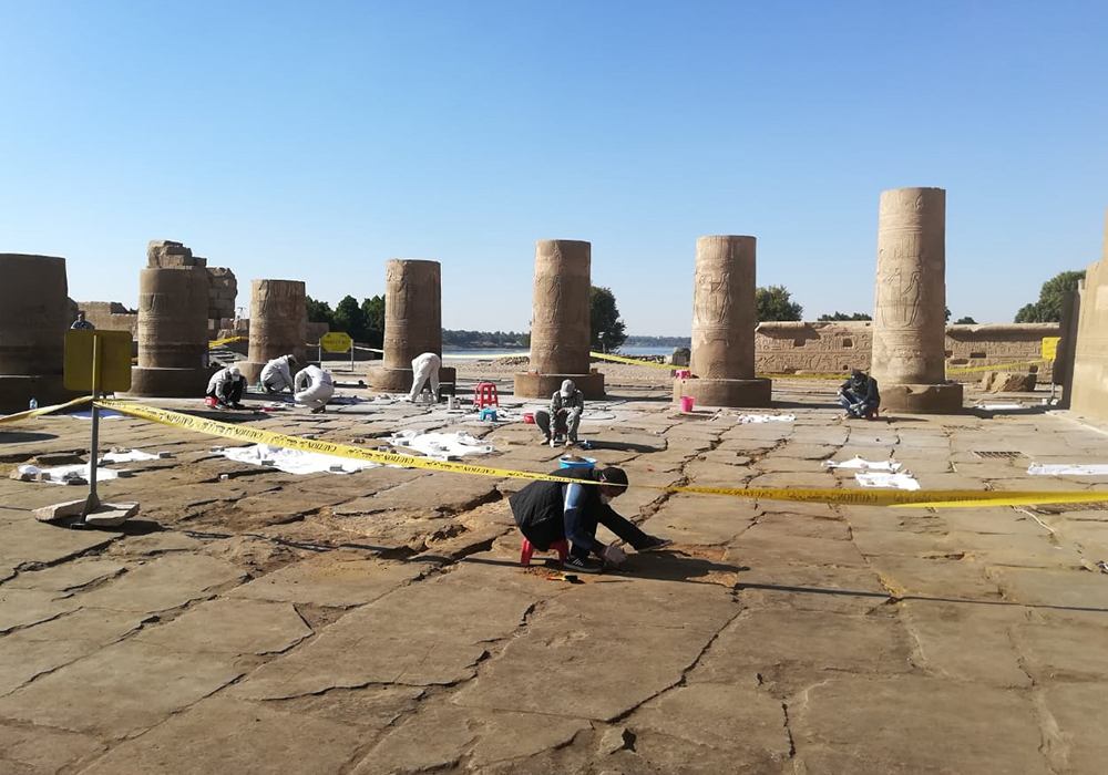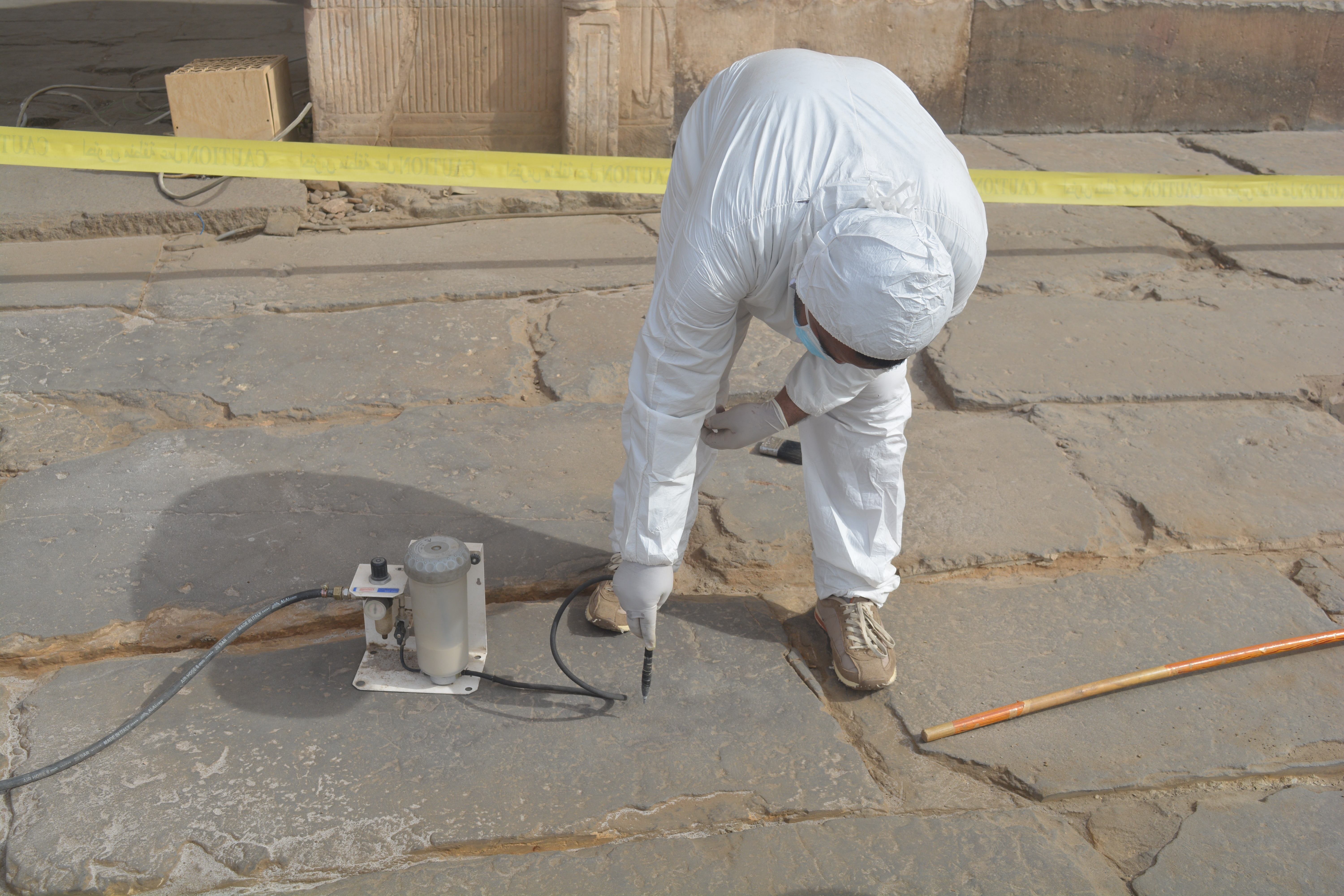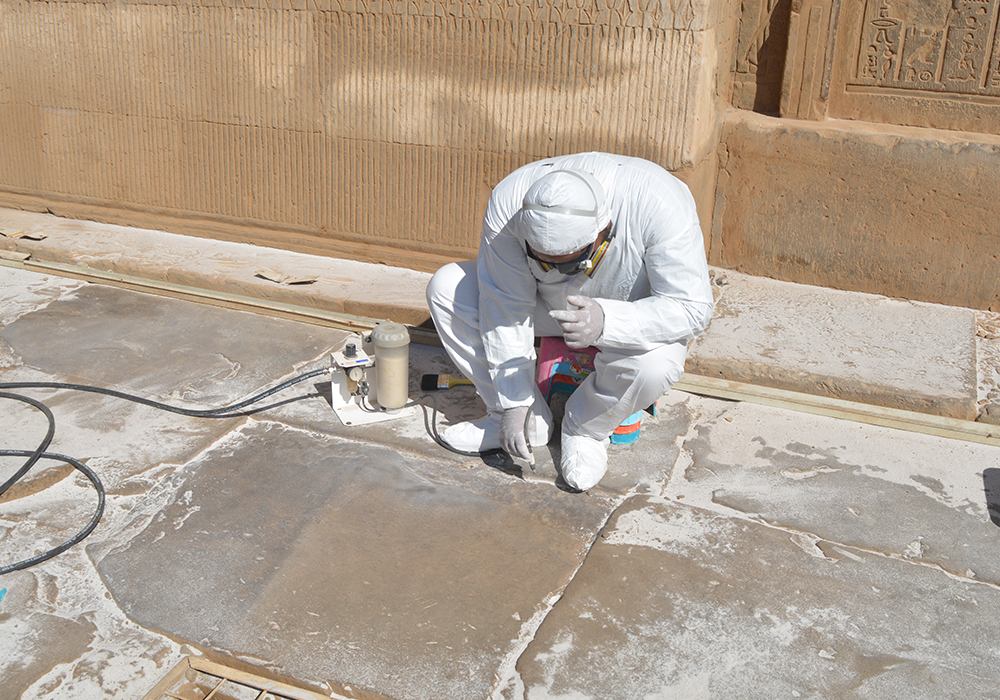 With our good reputation in conservation, Arab Contractors requested Adam Shearman to remove staining and missing sections in the stone forecourt flooring. This was encouraged and approved by the construction management firm under the engineering design group CDM Smith. The project was part of a USAID financed Groundwater Lowering Project. Pre-investigation, testing and analysis was conducted first to assess the treatment. Adam Shearman worked with Ministry of Tourism and Antiquities conservators as part of a training scenario. The project was on time and under budget.